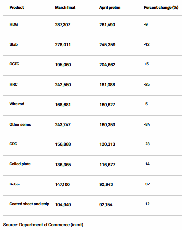 US steel imports fell 12% month on month in April amid lower shipments of sheet products and semi-finished steel, according to preliminary US Commerce Department data May 25.