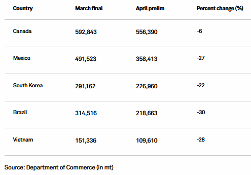 Canada was the largest exporter of steel to the US in April, with preliminary imports from the country totaling 556,390 mt, down 6% from March.