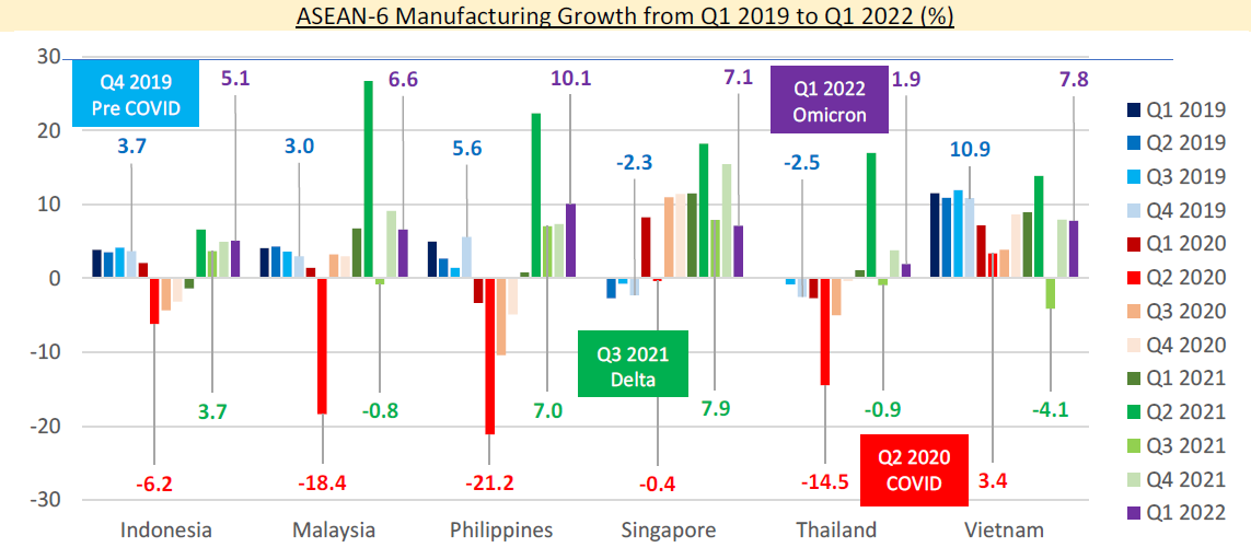 Malaysia, Thailand and Vietnam imposed restrictions during Q3 of 2021 and their economies were affected during that quarter. As such, they only registered 2 consecutive quarters of growth. Indonesia and Philippines registered 4 consecutive quarters of economic, while it was 5 quarters for Singapore.