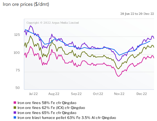 The OCE's 2022 average iron ore price forecast of $108/t is lower than the average ICX iron ore price for 62pc Fe ore that Argus assessed at around $120.27/t cfr China for the year to 20 December but above the $104.25/t for 58pc Fe. The average grade of Australian ore this year remains below 62pc Fe. Argus last assessed the ICX at $110.15/t cfr Qingdao on 20 December, down from a high for 2022 of $160.10/t on 1 April.