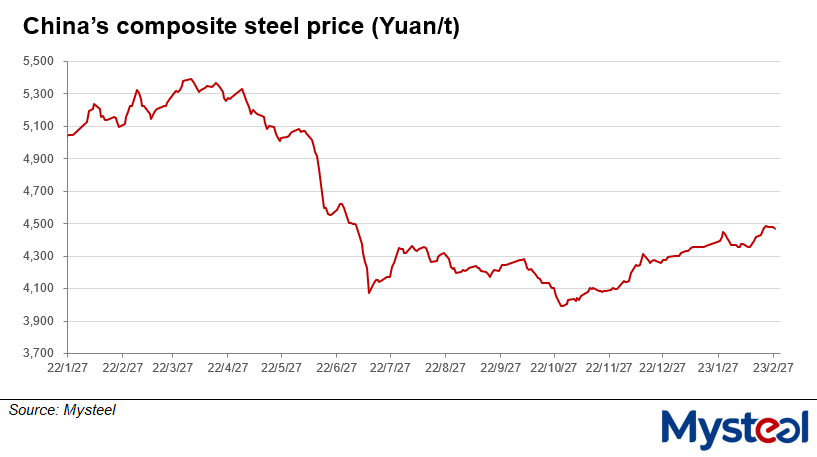 Nationwide steel prices had climbed slightly during February on improved market sentiment, with the composite steel price under Mysteel's assessment over February 1-27 averaging Yuan 4,407.1/tonne ($635.2/t), up by Yuan 50.5/t from that over January 3-31.