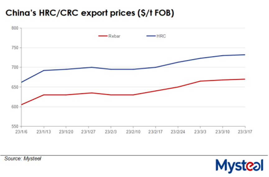 In sync with rising raw materials prices and the climb in hot rolled coil prices globally, prices of Chinese HRC for export maintained their upward momentum last week, with the export price of SS400 4.75mm HRC under Mysteel's assessment inching upbya tiny $2/tonneon weekas of March 17 to reach $670/t FOB from North China's Tianjin port.