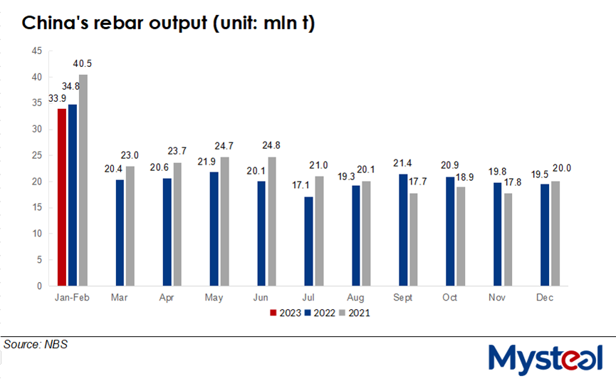 Rebar, the most widely produced steel item in China, accounted for 16.4% of the 206.2 million tonnes of finished steel the country produced during January-February, Mysteel Global calculated based on the NBS data.