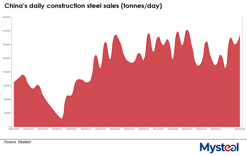 China's spot sales of construction steel including rebar bounced back above the 200,000 tonnes/day threshold again on March 28, or the fourth time so far this month, according to Mysteel's data. This also marked the first time the daily transaction volume topping the threshold within half a month.