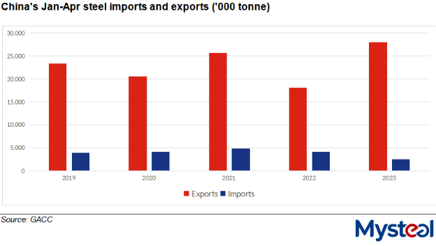 Steel exports over the four months enjoyed a significant on-year increase largely thanks to the low base in 2022 when the country – still struggling with COVID controls and logistics challenges – exported just 18.15 million tonnes of finished steel, a relatively low record over the recent five years, Mysteel Global learned.