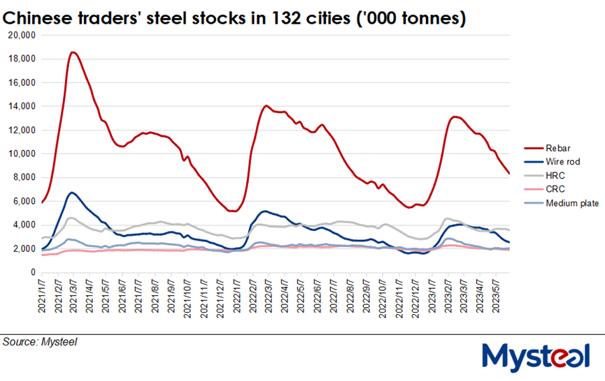 The stocks of rebar, wire rod, medium plate, hot-rolled coil and cold-rolled coil among traders in 132 cities Mysteel samples decreased by 3.2% on week to refresh a 4.5-month low of 18.3 million tonnes as of June 1.