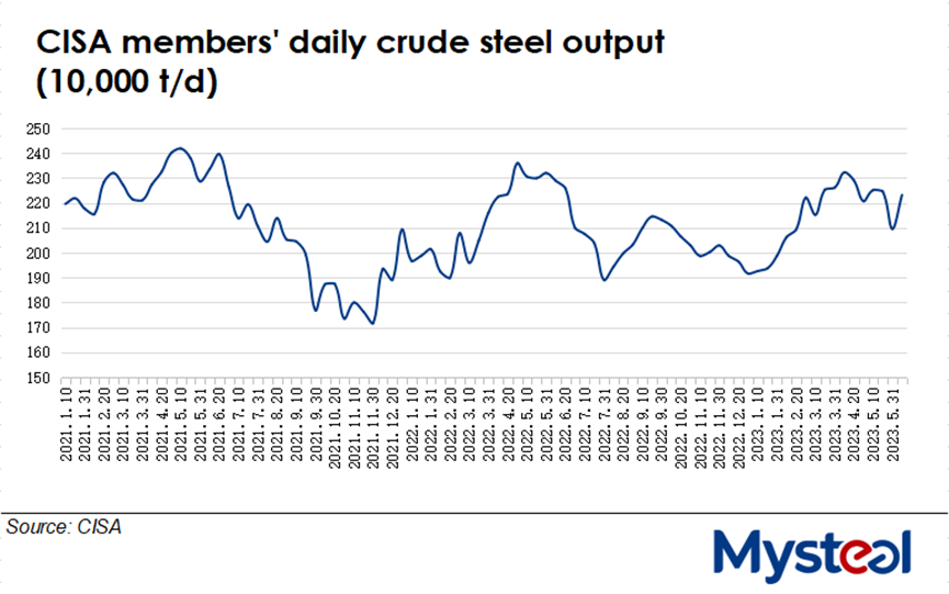 Daily crude steel output among the member mills of the China Iron and Steel Association (CISA) rebounded during the first 10 days of June, data from the association's latest release on June 13 showed, with the volume growing by some 135,700 tonnes/day or 6.5% from late May's average, as against the 6.7% decline in the prior period.