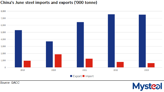 For June alone, however, steel exports declined both on-month and on-year, with the tonnage reaching 7.51 million tonnes, lower by 10% from May and by a tiny 0.6% from June 2022, the Customs data showed.