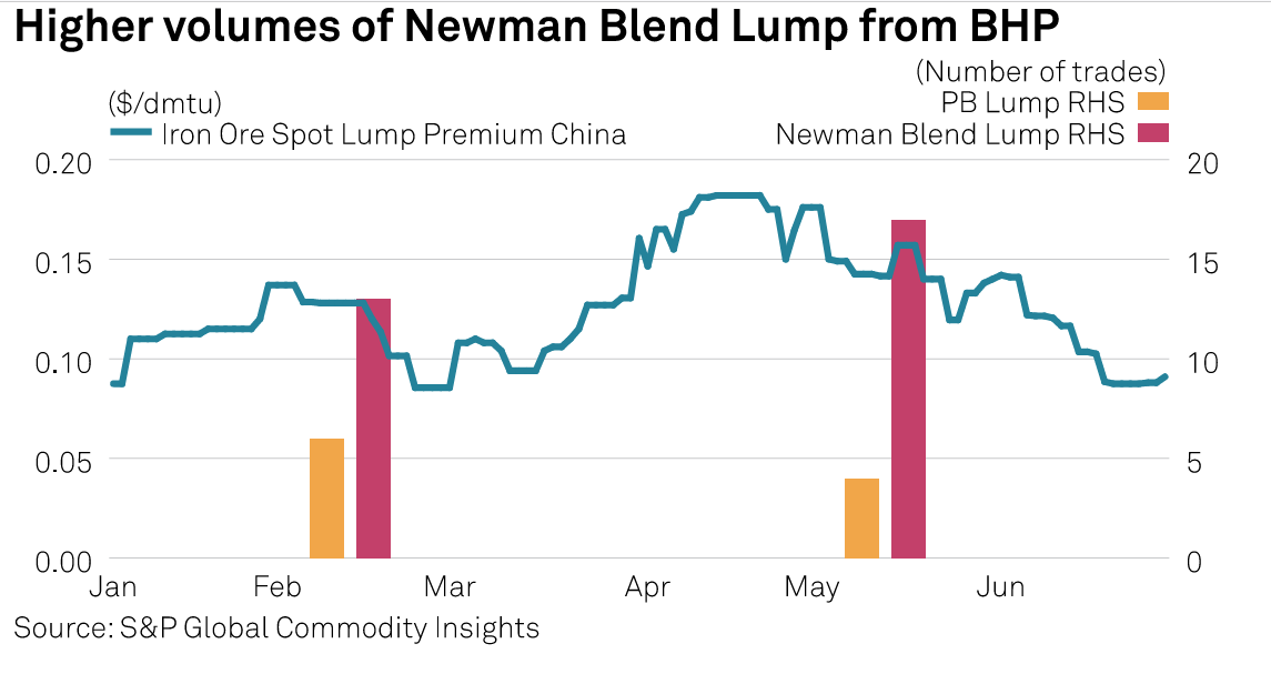 BHP raised its lump spot sales volume amid Chinese sintering cuts as mills in the country pivoted towards direct charge metals as feedstock, eventually pressuring seaborne spot lump premiums, according to an S&P Global survey of market participants. Lump premiums fell to a four-month low of 8.7 cents/dmtu June 21.
