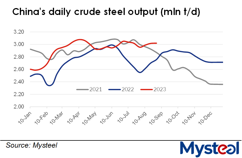 Daily average crude steel output in China hovered relatively high at 3.02 million tonnes/day over the last 11 days of August, increasing by another 4,300 t/d or 0.1% from mid-August, according to Mysteel's estimate based on its survey among 247 blast-furnace (BF) and 87 electric-arc-furnace (EAF) steel mills nationwide.
