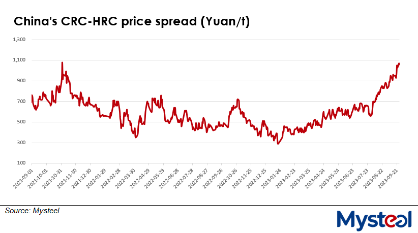 The price spread between carbon steel cold-rolled coil (CRC) and hot-rolled coil (HRC) in China has continued to widen since August, with the price differential between SPCC 1.0mm CRC and Q235 4.75mm HRC in Shanghai hitting a 22-month high of Yuan 1,070/tonne ($146.4/t) as of September 25, Mysteel's latest tracking showed.