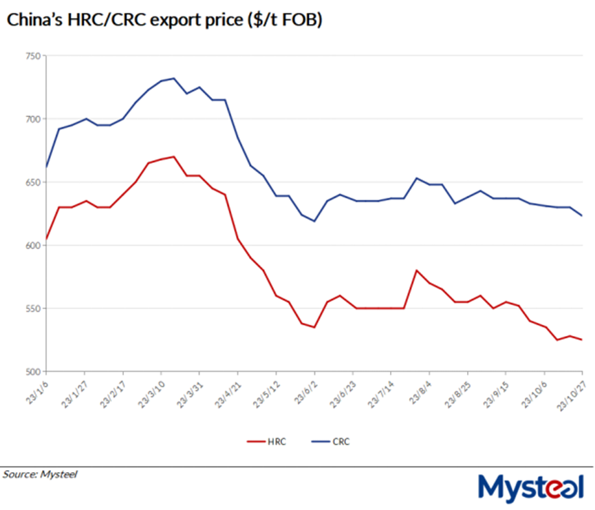 As of October 27, the export price of Chinese SS400 4.75mm HRC under Mysteel's assessment was at $525/tonne FOB from North China's Tianjin port, lower by $3/t on week. On the same day, the export price of China-origin SPCC 1.0mm cold-rolled coil had also fallen on week, dipping by $7/t to reach $623/t, also on FOB Tianjin basis.
