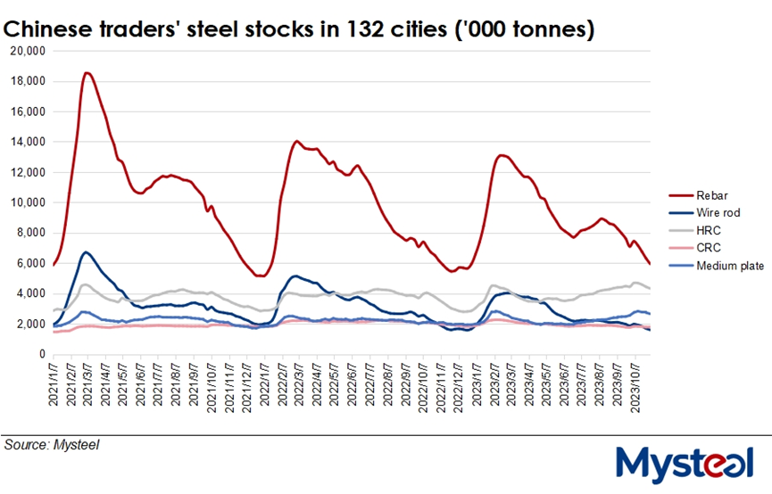 The inventories of rebar, wire rod, hot-rolled coil (HRC), cold-rolled coil and medium plate at traders' warehouses in the 132 cities Mysteel tracks nationwide declined for a fourth straight week, down by 632,700 tonnes on week at 16.3 million tonnes as of November 2, the data indicated.