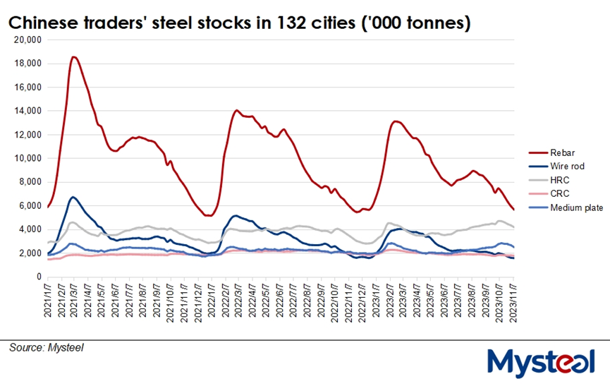 The stocks survey among traders in 132 cities nationwide under Mysteel's tracking found that their inventories of rebar, wire rod, hot-rolled coil, cold-rolled coil and medium plate had fallen by 4.1% on week to reach a ten-month low of 15.7 million tonnes as of November 9.