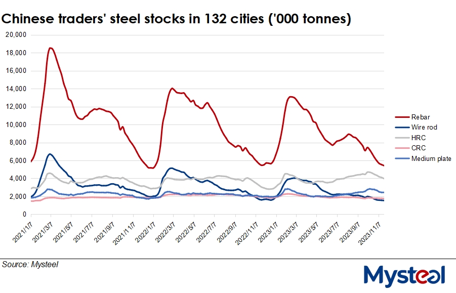 Inventories of the five major finished steel products in traders' warehouses in the 132 cities Mysteel monitors fell for the seventh successive week, losing another 2.1% on week to total 15.1 million tonnes as of November 23, the latest data showed. The five products comprise rebar, wire rod, hot-rolled coil (HRC), cold-rolled coil and medium plate.