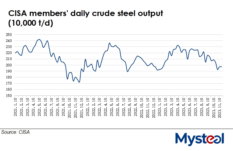 Daily crude steel output among the member mills of the China Iron and Steel Association (CISA) over November 11-20 reversed down from early November, though falling by just 0.08% or 1,500 tonnes/day to average 1.97 million t/d, according to the association's release late Wednesday. Average daily output during mid-November was lower by 1.6% on year, it notes.