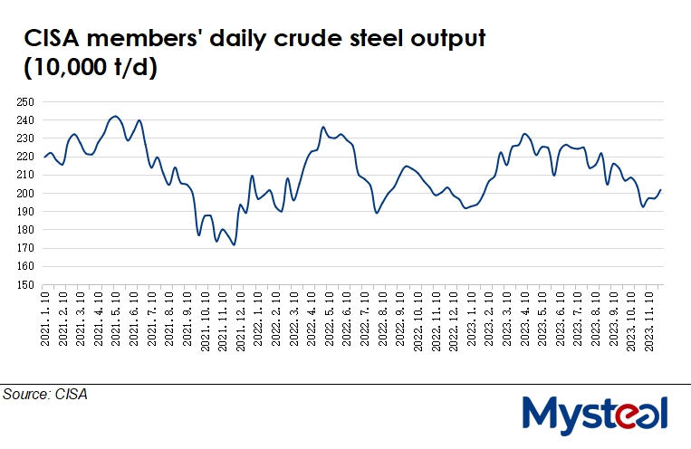 Based on its member-mill results, CISA also estimated that the country's daily crude steel output averaged 2.58 million t/d over November 21-30, rising by 1.7% from mid-November.