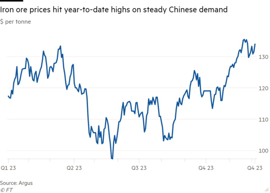 China’s robust demand for iron ore — it has imported 1.1bn tonnes this year, mostly from Australia and Brazil, up 6 per cent on the first 11 months of 2022 — has come despite a sharp drop in demand for property construction, as developers have buckled under the weight of large debt piles. A pipeline of government-backed infrastructure and manufacturing projects has only partially offset the real estate downturn.