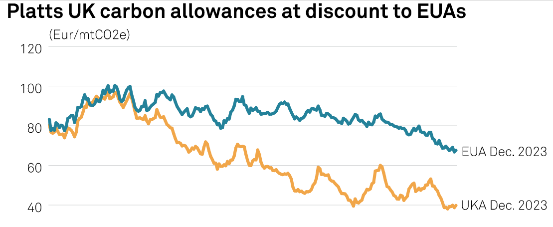 Platts last assessed UKA Dec 2023 at Eur39.79/mtCO2e on Dec. 15 compared to Eur67.58/mtCO2e for EUA Dec. 2023.