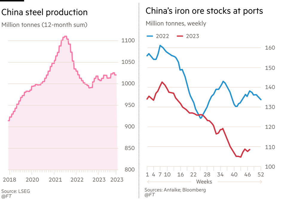 Two charts. First, an area chart, showing China steel production. Million tonnes (12-month sum) from 2018 to 2023. Second chart, Line chart, China’s iron ore stocks at ports million tonnes, weekly. Figures are comparative for 2022 and 2023.
