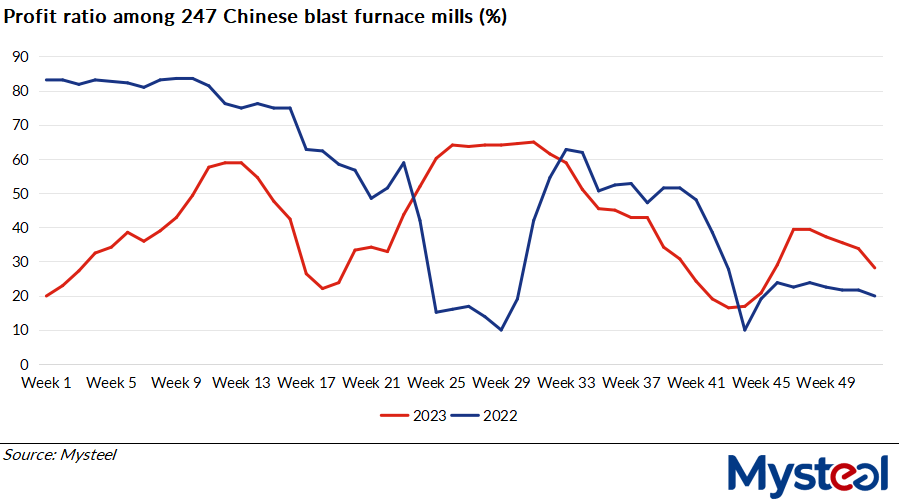 For example, HRC production among the 37 Chinese flat steel producers Mysteel regularly monitors came in at 3.26 million tonnes over December 18-22, the highest weekly total since mid-June 2022, according to Mysteel's weekly survey.
