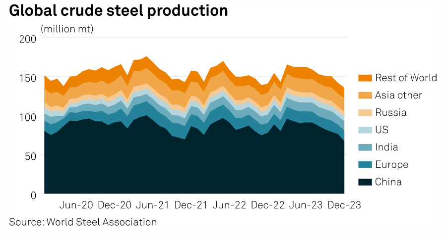 According to analysts with S&P Global Commodity Insights, China's steel production is expected to slow by 0.5% in 2024 as mills look to address oversupply and weak profit margins.