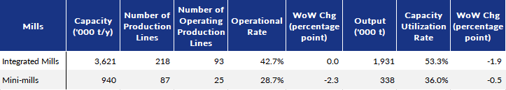 During the survey period, both the rebar rolling capacity utilization and the operational rates among these surveyed makers decreased for the fifth week in a row, with the former dipping by 1.6 percentage points on week to 49.7%, and the latter easing by 0.7 percentage point on week to 38.7%.