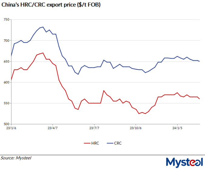 For example, during the first half of last week some steelmakers in North China tabled their export offering prices for Q195 HRC at $560/t CFR to Vietnam, while the price was later lowered to $552/t CFR in the latter part of the week.