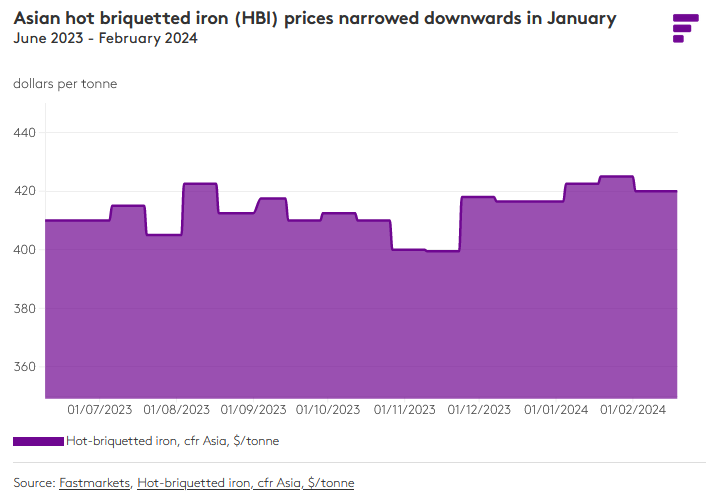 Fastmarkets assessed Asia HBI prices at $415-425 per tonne CFR Asia on February 16, unchanged week on week.