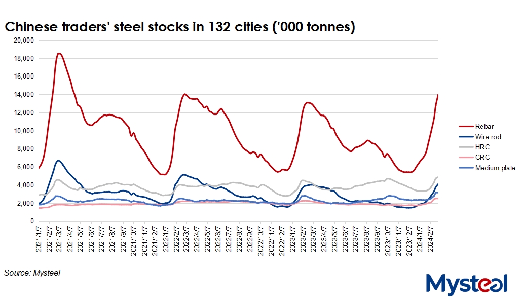 The stocks of the five major finished steel items comprising rebar, wire rod, hot-rolled coil, cold-rolled coil and medium plate held by traders across the 132 cities Mysteel tracks climbed by 6.4% on week to reach 28.7 million tonnes as of February 29, lower than the 11.4% hike a week earlier, according to the latest data.