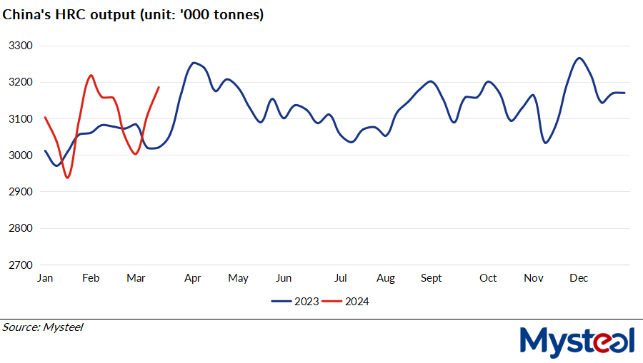 Production of hot-rolled coils (HRC) among the 37 Chinese flat steel producers Mysteel regularly monitors increased further during the week of March 11-15 to reach 3.19 million tonnes, higher by 76,300 tonnes or 2.45% on week, the results of the latest weekly production survey show.