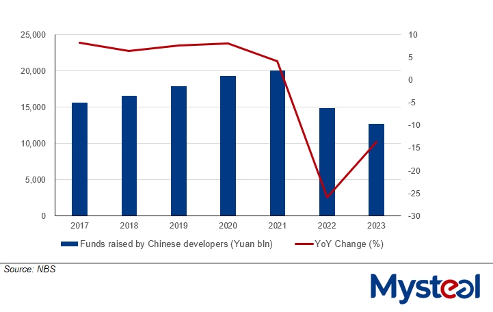 On the other hand, the continual decline in funds raised by property firms has led to a slowdown in investment activities. Total funds raised by Chinese property developers slipped by 13.6% on year to Yuan 12.7 trillion ($1.8 trillion) in 2023, and their investments dropped by 16.5% on year to Yuan 1.11 trillion in tandem, NBS data show. The decline in investments enlarged by 6.5 percentage points compared to the previous year, Mysteel notes.