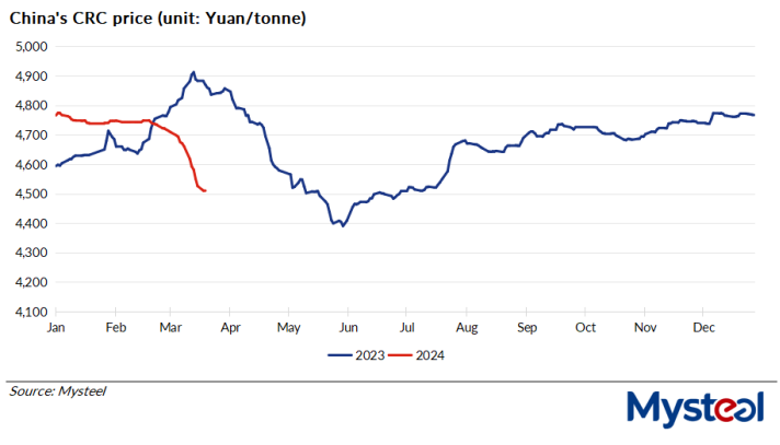 As of March 18, China's spot price of 1.0mm cold-rolled coil under Mysteel's assessment had declined for 20 consecutive working days to refresh a more-than-eight-month new low of Yuan 4,510/tonne ($626.5/t) including the VAT, dropping by Yuan 373/t or 7.6% on year.