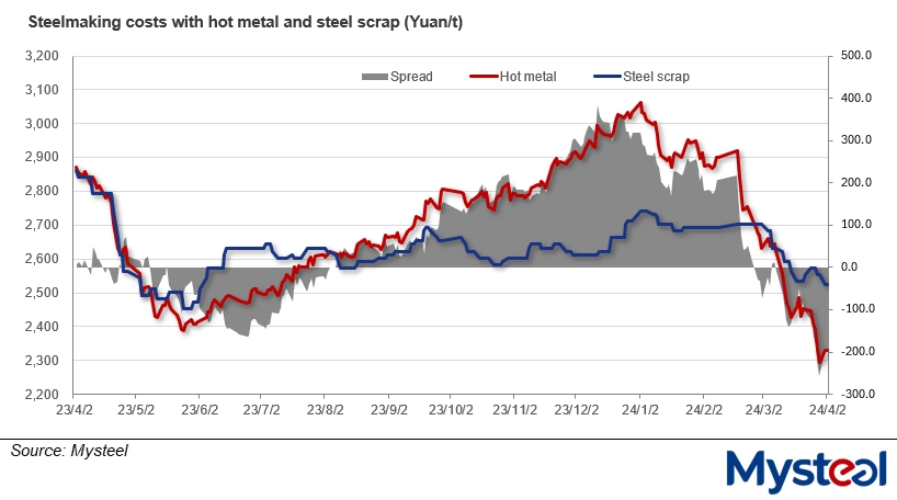 As of April 2, the cost of making steel using hot metal among integrated mills in East China's Jiangsu province averaged Yuan 2,332/tonne ($328.8/t) excluding the 13% VAT, lower by a significant Yuan 192/t compared with using steel scrap, according to Mysteel's assessment.
