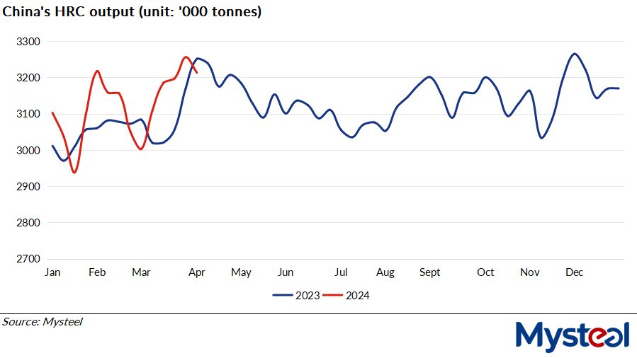 Output of hot-rolled coils (HRC) among 37 Chinese flat steel producers Mysteel regularly monitors reversed down last week from the rises of the five previous weeks, declining 42,600 tonnes or 1.3% on week during April 8-12 to total 3.21 million tonnes, Mysteel'slatest weekly production survey shows.