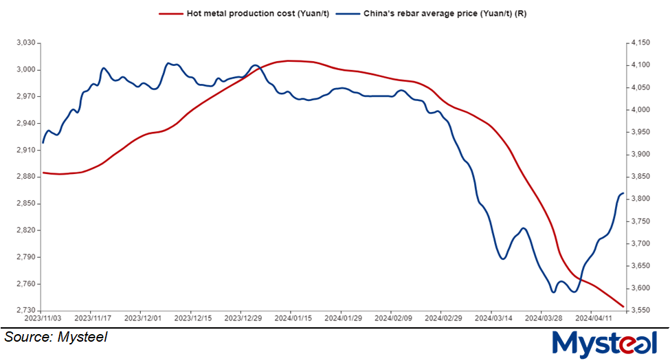 One major reason for the improved profitability of the domestic mills was the continuous fall in their production costs. Over April 12-18, the average cost of making hot metal among the 114 Chinese mills monitored by Mysteel was assessed at Yuan 2,734/tonne ($378/t) excluding the 13% VAT, down by another Yuan 21/t from the previous week and touching the lowest since August 2023.