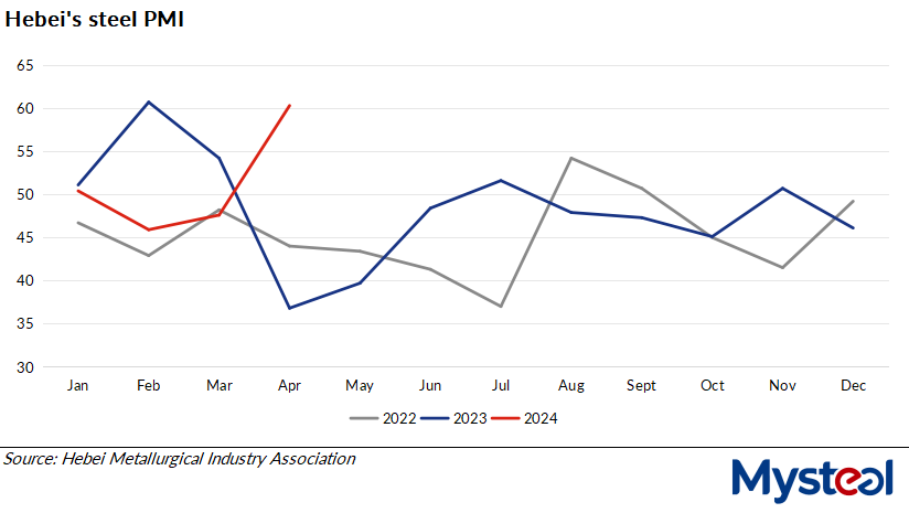 Hebei's PMI reading last month was also 12.4 percentage points higher than that of the national steel PMI released by the official index compiler CFLP Steel Logistics Professional Committee, which gained 3.7 percentage points on month to score 47.9 in April, as Mysteel Global reported.