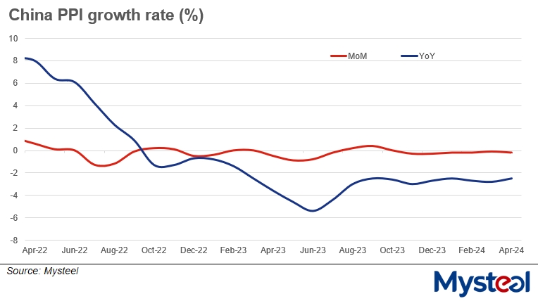 Meanwhile, China's steelmaking and fabrication industry saw its ex-works prices drop 2.5% on month and decrease 8.5% on year in April, with finished steel supply expanding at a faster pace last month, the NBS data showed.