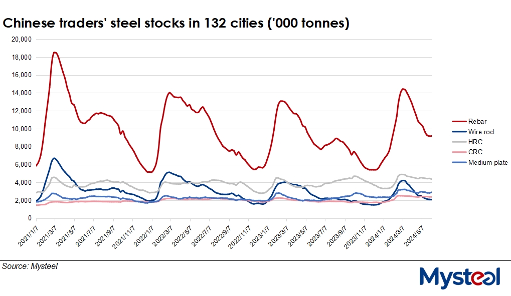 Total inventories of the five steel items comprising rebar, wire rod, hot-rolled coil, cold-rolled coil and medium plate held by traders in the 132 Chinese cities Mysteel monitors bounced back by a small 14,900 tonnes on week to nearly 21 million tonnes as of June 6.