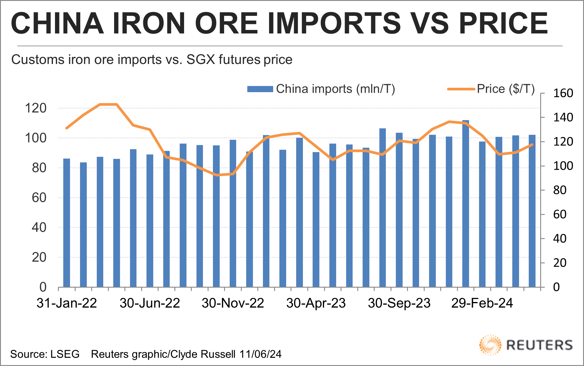 China, which buys about 75% of global seaborne iron ore, imported 102.3 million metric tons in May, according to customs data, marking a third straight month of arrivals of more than 100 million tons.
