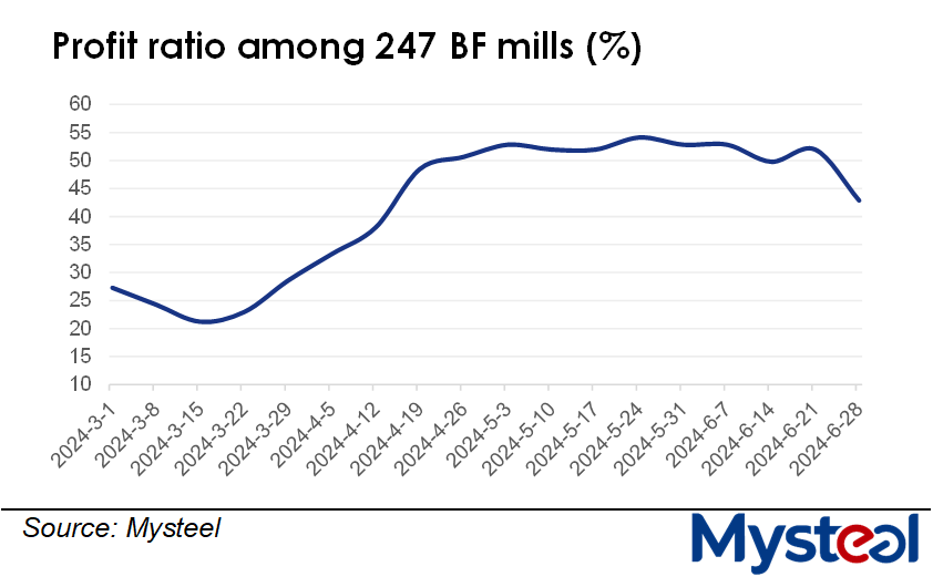 Mysteel's latest weekly survey showed that as of June 27, the profit ratio among the 247 blast furnace mills nationwide under its regular tracking had slipped to a 2.5-month low of 42.86%, falling by 9.09 percentage points from the prior week.