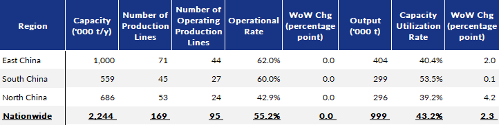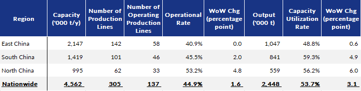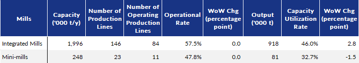During the survey period, the rebar rolling capacity utilization rate among the surveyed producers picked up by 3.1 percentage points on week to 53.7% while their operational rate gained further by 1.6 percentage points on week to 44.9%.