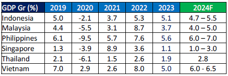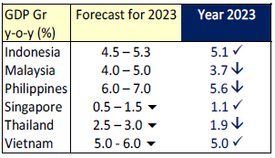 For the full year, while all ASEAN-6 countries registered positive growth in 2023, Indonesia, Singapore and Vietnam met their forecasts while Malaysia, Philippines and Thailand growths were below forecast.