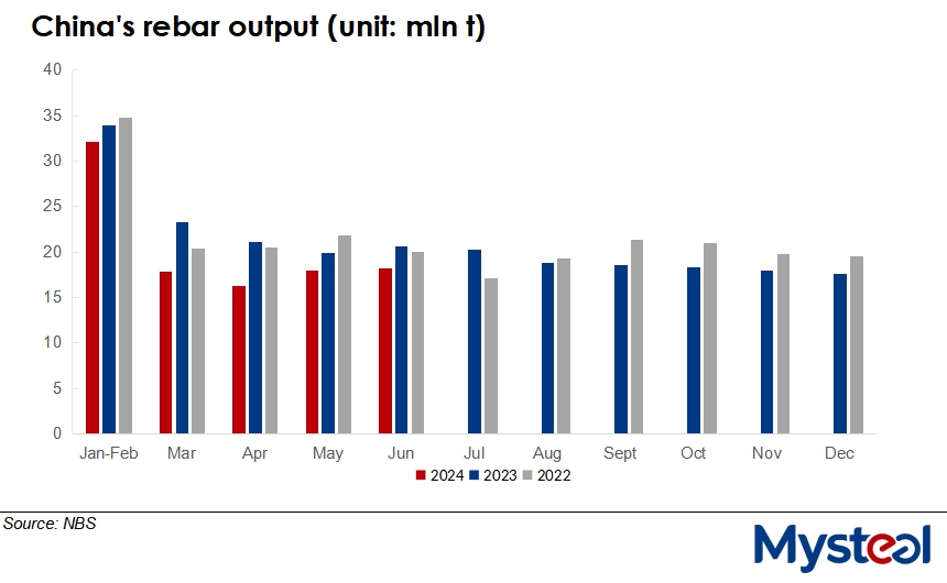For June alone, China churned out 18.2 million tonnes of rebar, lower by 10.1% on year, according to NBS, though this number represented a 1.4% gain from May, Mysteel Global calculated.