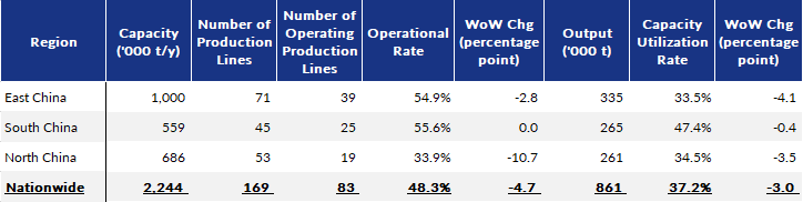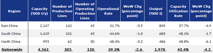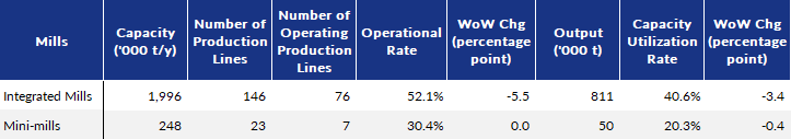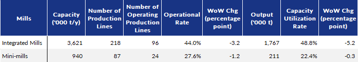 During the survey period, the rebar rolling capacity utilization rate among the surveyed steel producers slipped by 4.2 percentage points on week to 43.4%, and the operational rate among these mills eased by 2.6 percentage points on week at 39.3%, Mysteel's data indicated.