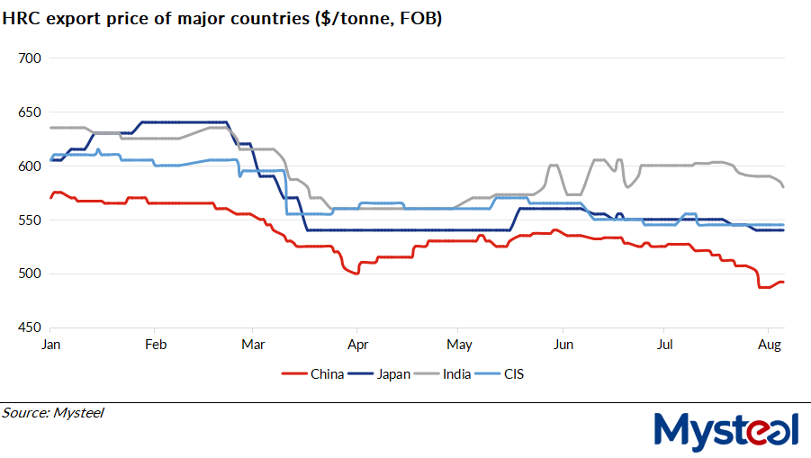 For example, as of May 31, the export price of SS400 3.00mm hot-rolled coil from North China's Tianjin port was assessed by Mysteel at $540/t FOB, lower by $20/t from Japan-origin offers posted the same day, according to Mysteel's tracking.