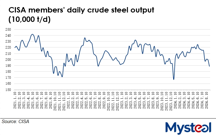 Daily crude steel output among the member mills of the China Iron and Steel Association (CISA) touched the intra-year low of 1.89 million tonnes/day during the last 11 days of August, falling by 5.4% or 108,000 t/d from mid-August, faster than the 0.5% drop in the prior 10-day period, according to the association's new release on September 7.