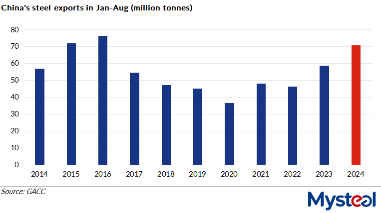 For August alone, the country's steel exports climbed by 14.7% on year to around 9.5 million tonnes, Mysteel Global calculated based on the Customs data.