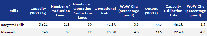 During the survey week, the rebar rolling capacity utilization rate among the surveyed producers moved up by 2.1 percentage points on week to 41.2%, and their operational rate edged up 0.6 percentage point on week to 36.7%, Mysteel's data showed.