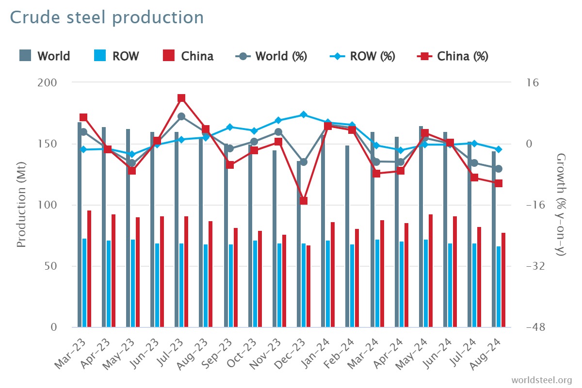 World crude steel production for the 71 countries reporting to the World Steel Association (worldsteel) was 144.8 million tonnes (Mt) in August 2024, a 6.5% decrease compared to August 2023.